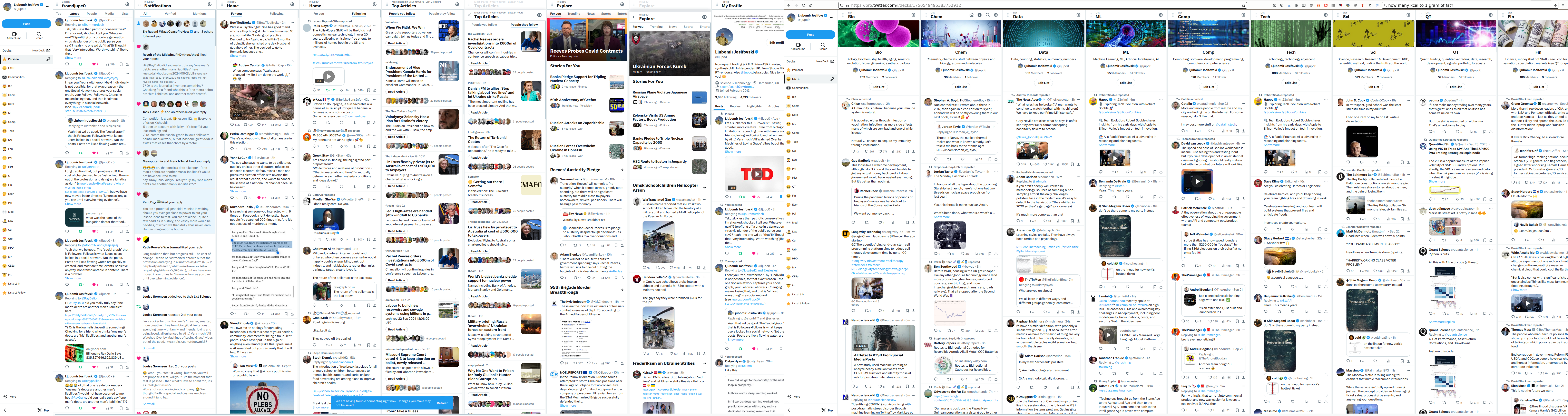 Personally, I find my Twitter experience positive overall. I read about negative encounters, but I rarely see ugliness on my TL. I believe it the 1st time when people show me who/what they are or stand for: I am quick to block and mute, not into giving 2nd chances (online; IRL I'm not like that). There are another 8 Billion people that we can interact with online! No need to easily avoidable aggravation. I rely on Lists - Sci-ence, Tech-nology, Comp-uting, Bio-logy, Che-mistry... - to curate my feeds beyond just "For You" and "Followers". Lists help shape the timeline, maintain focus and have ok SNR. Additionally, I tie individual Lists to separate Decks on XPro, effectively creating personalized thematic websites. XPro decks setup for X Lists. (click to zoom)